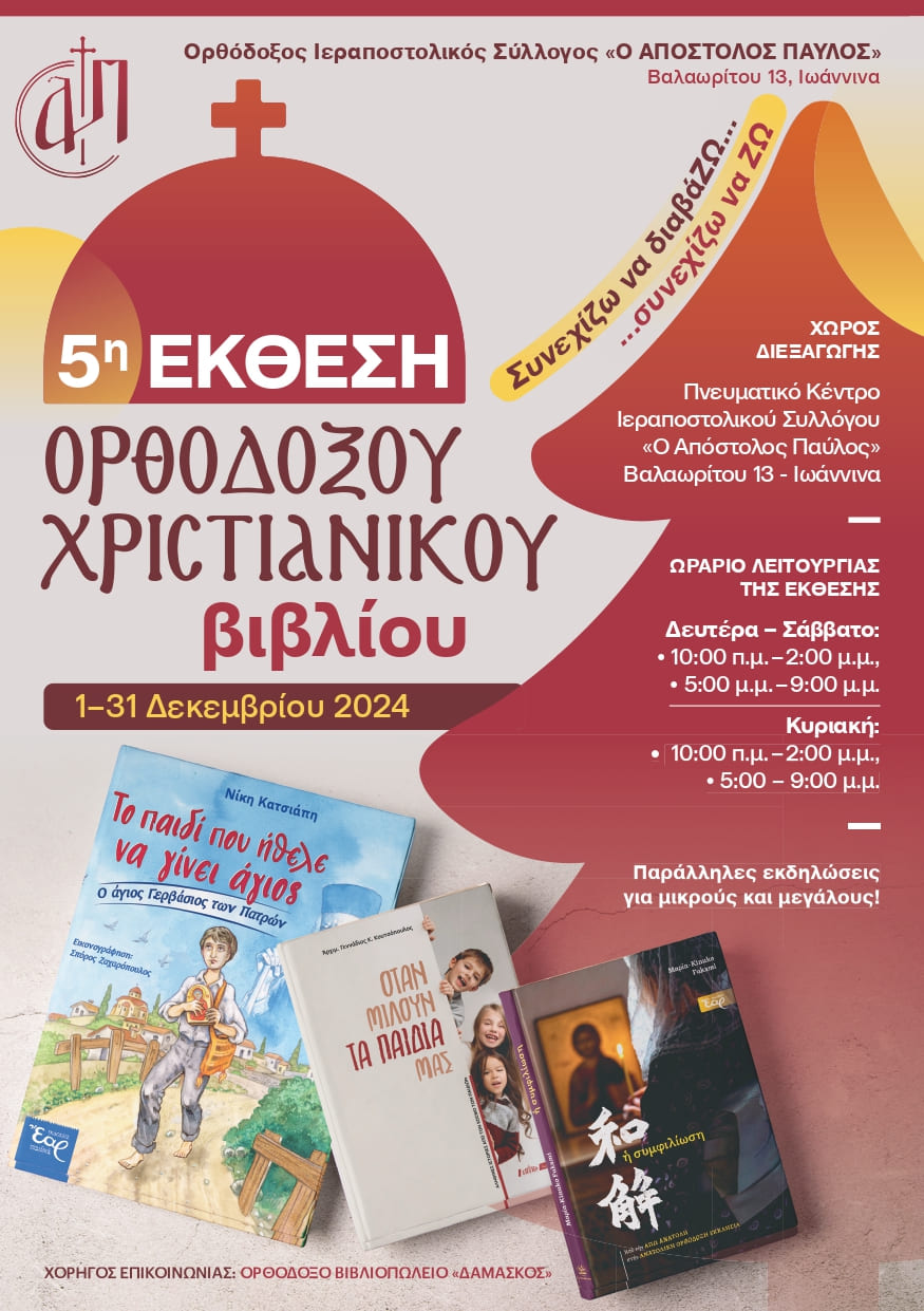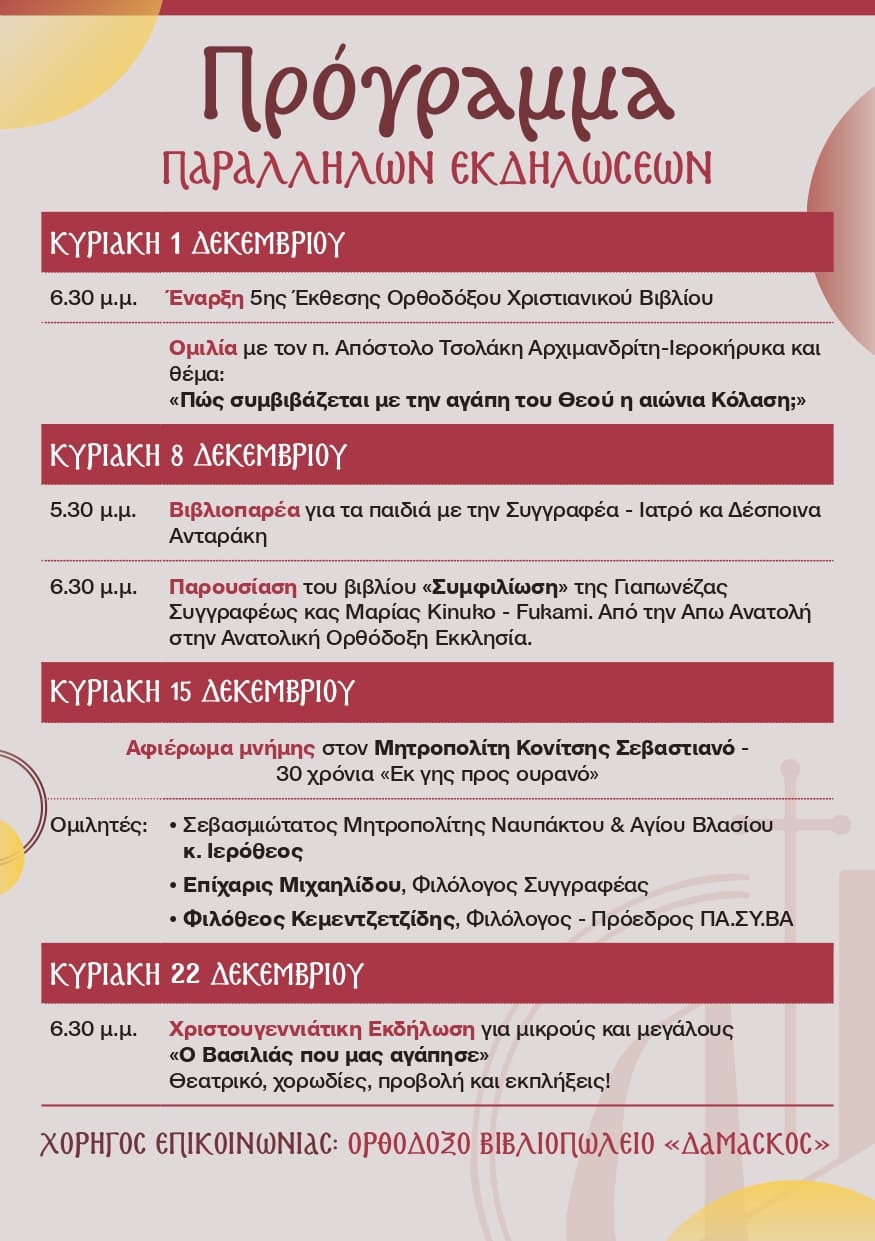 Έναρξη 5ης Έκθεσης Ορθόδοξου Χριστιανικού Βιβλίου Οµιλία με τον π. Απόστολο Τσολάκη Αρχιμανδρίτη - Ιεροκήρυκα και θέμα: |