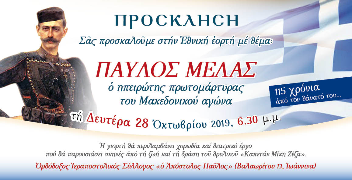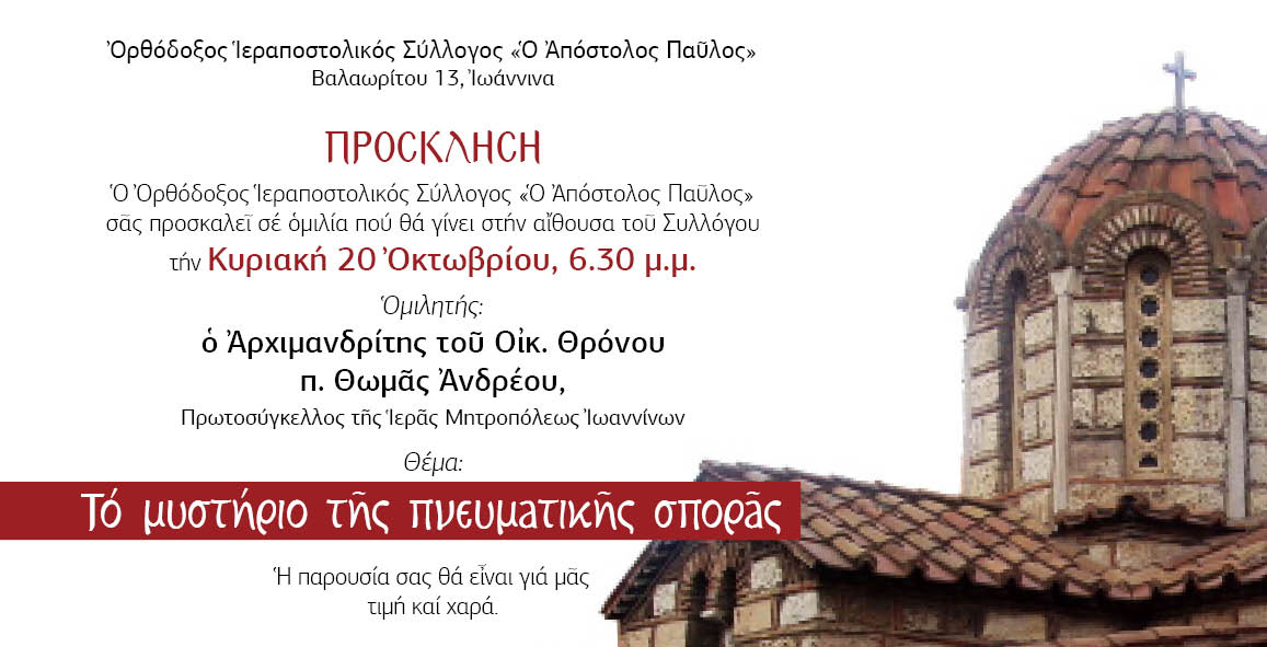 Ο Ορθόδοξος Ιεραποστολικός Σύλλογος «Ο Απόστολος Παύλος» σας προσκαλεί σε ομιλία που θα γίνει στην αίθουσα του Συλλόγου την την Κυριακή 20 Οκτωβρίου, 6.30 µ.µ.