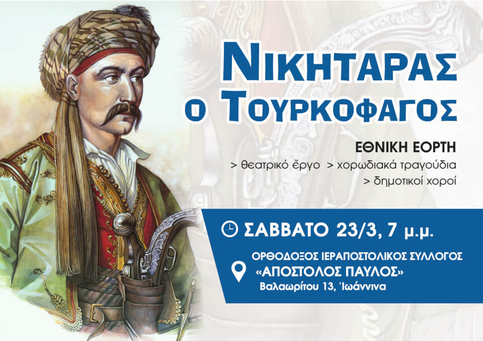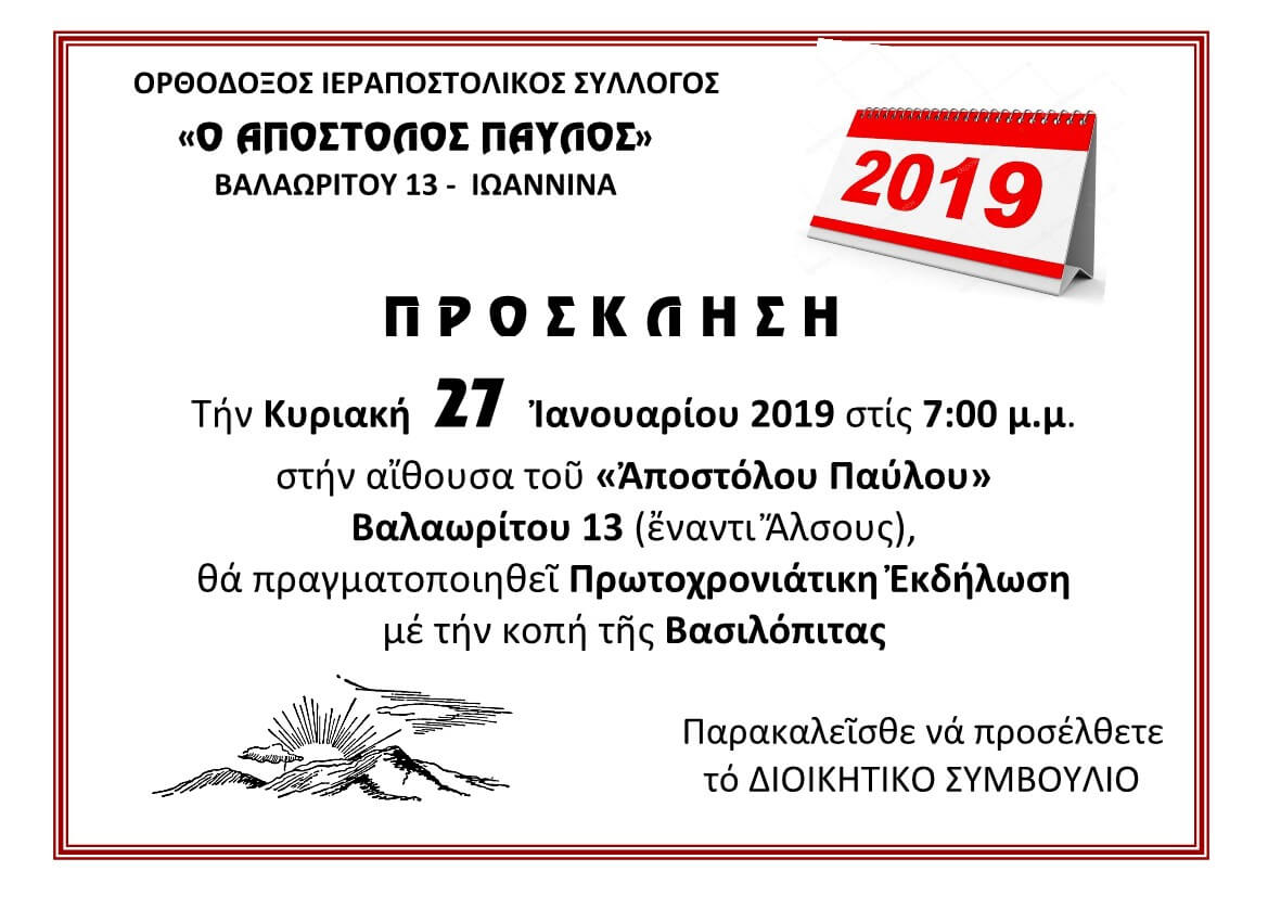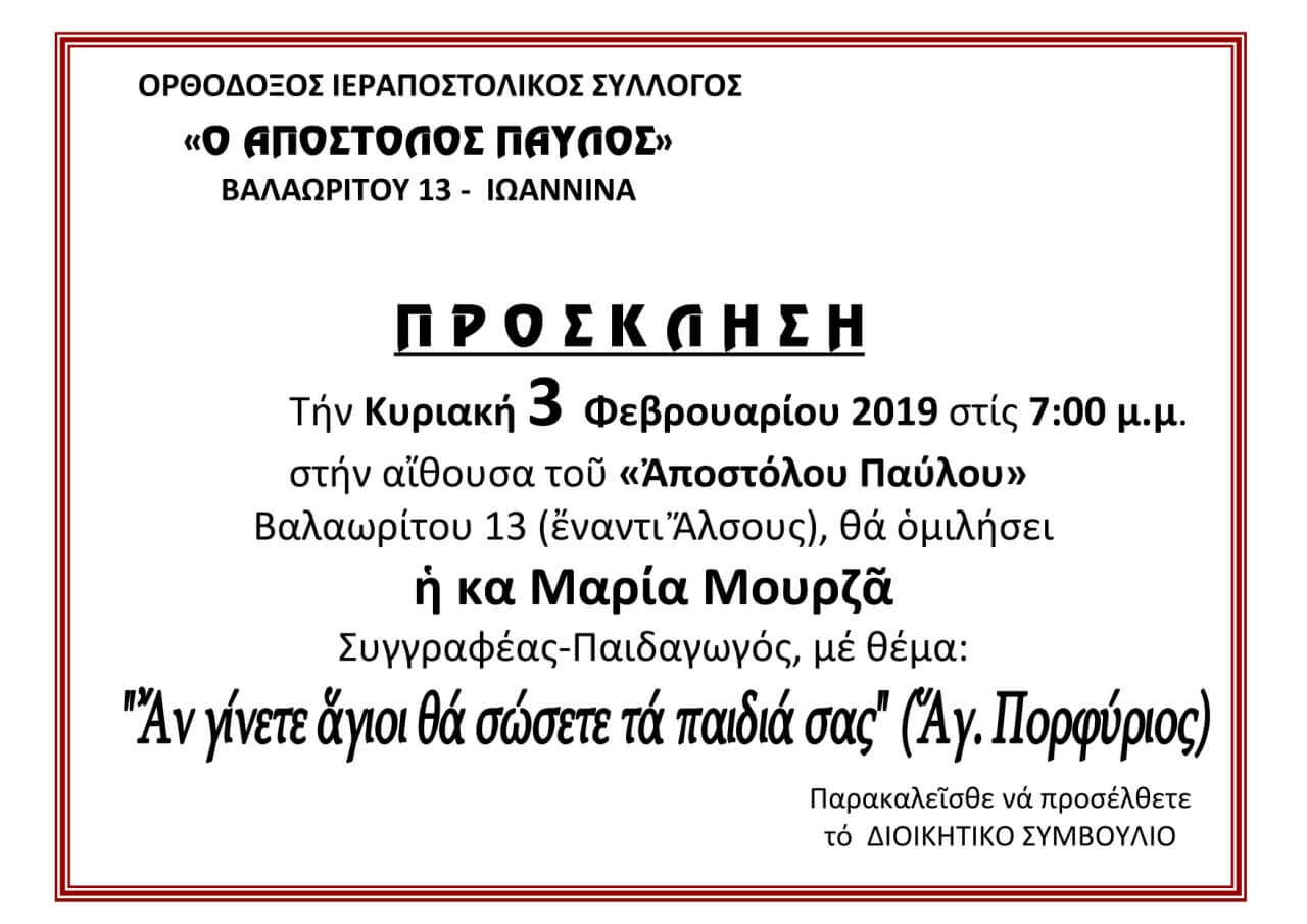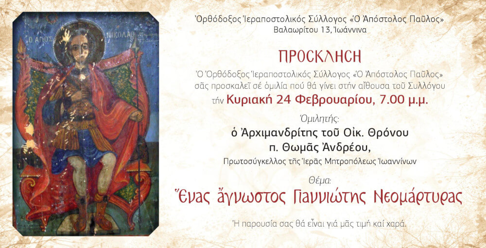 Ὁ Ὀρθόδοξος Ἱεραποστολικός Σύλλογος «Ὁ Ἀπόστολος Παῦλος» σᾶς προσκαλεῖ σέ ὁµιλία πού θά γίνει στήν αἴθουσα τοῦ Συλλόγου τήν Κυριακή 24 Φεβρουαρίου, 7.00 µ.µ. Ὁµιλητής: ὁ Ἀρχιµανδρίτης τοῦ Οἰκ. Θρόνου π. Θωµᾶς Ἀνδρέου, Πρωτοσύγκελλος τῆς Ἱερᾶς Μητροπόλεως Ἰωαννίνων Θέµα:Ἕνας ἄγνωστος Γιαννιώτης Νεομάρτυρας