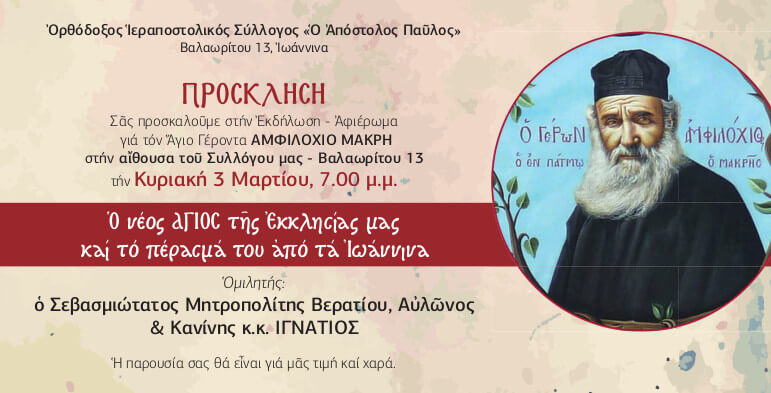 Σᾶς προσκαλοῦµε στήν Ἐκδήλωση - Ἀφιέρωµα γιά τόν Ἅγιο Γέροντα ΑΜΦΙΛΟΧΙΟ ΜΑΚΡΗ στήν αἴθουσα τοῦ Συλλόγου µας - Βαλαωρίτου 13 τήν Κυριακή 3 Μαρτίου, 7.00 µ.µ. Ὁ νέος ΑΓΙΟΣ τῆς Ἐκκλησίας μας καί τό πέρασμά του ἀπό τά Ἰωάννινα Ὁµιλητής: ὁ Σεβασµιώτατος Μητροπολίτης Βερατίου, Αὐλῶνος & Κανίνης κ.κ. ΙΓΝΑΤΙΟΣ