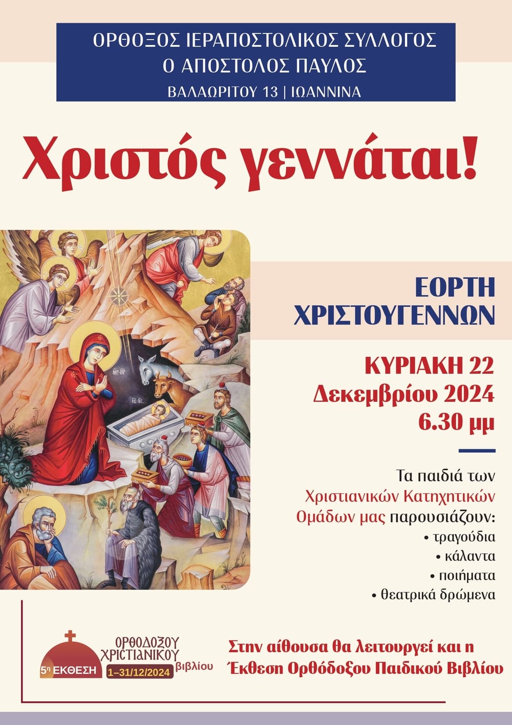 Σε πανηγυρική ατμόσφαιρα κ με την συμμετοχή δεκάδων συμπολιτών μας, ο Ιστορικός και Ιεραποστολικός Σύλλογος Ιωαννίνων «ο Απόστολος Παύλος» έκοψε την πρωτοχρονιάτικη Βασιλόπιτα, την Κυριακή 19 Ιανουαρίου 2025, στις 6.30μμ.