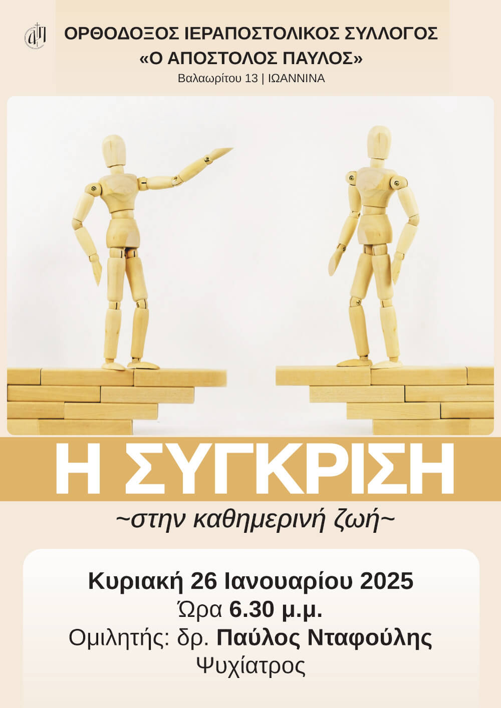 Την ερχόμενη Κυριακή στο ίδιο χώρο και την ίδια ώρα 6.30μμ θα μιλήσει ο Στρατιωτικός Ψυχίατρος κ. Παύλος Νταφούλης με θέμα «Η σύγκριση στην καθημερινή ζωή».