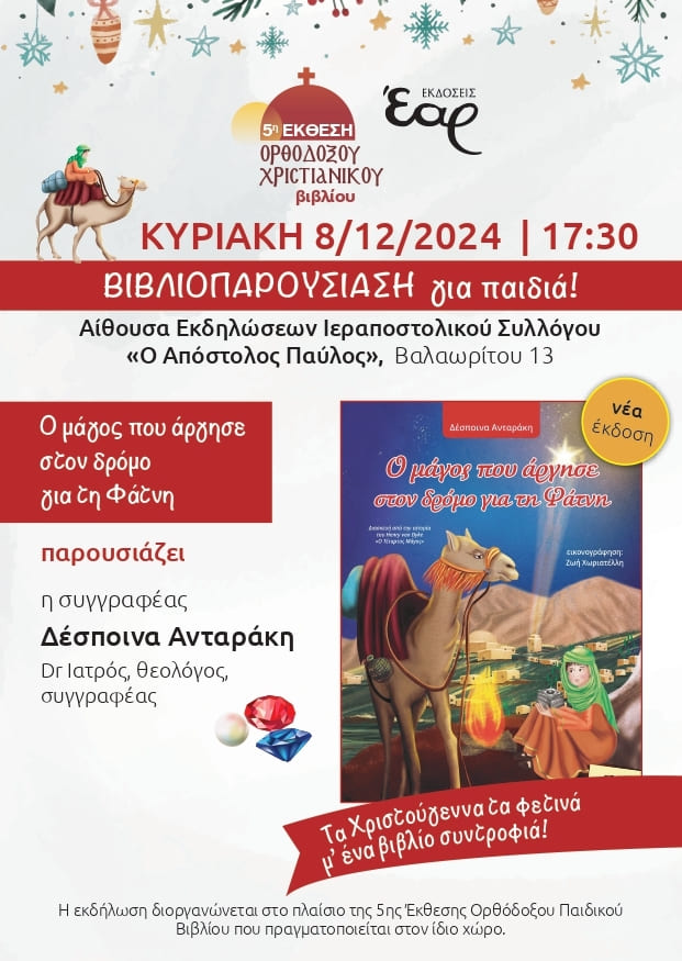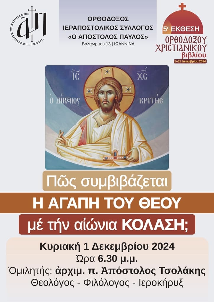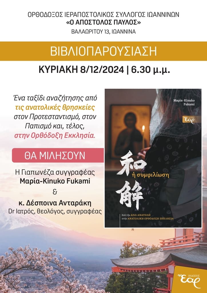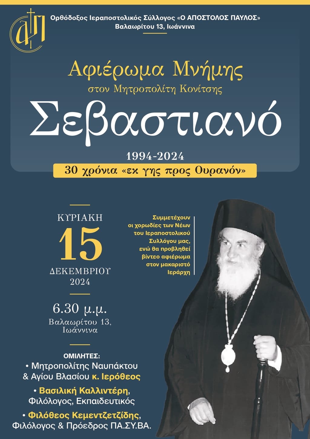 Σας προσκαλούμε την Κυριακή 15 Δεκεμβρίου 2024, στις 6.30 μ.μ. στην Αίθουσα Εκδηλώσεων του Συλλόγου (Βαλαωρίτου 13) στο Αφιέρωμα μνήμης για τον Μακαριστό Μητροπολίτη Δρυϊνουπόλεως, Πωγωνιανής και Κονίτσης κυρό ΣΕΒΑΣΤΙΑΝΟ με αφορμή τη συμπλήρωση 30 χρόνων από την κοίμησή του, με θέμα: