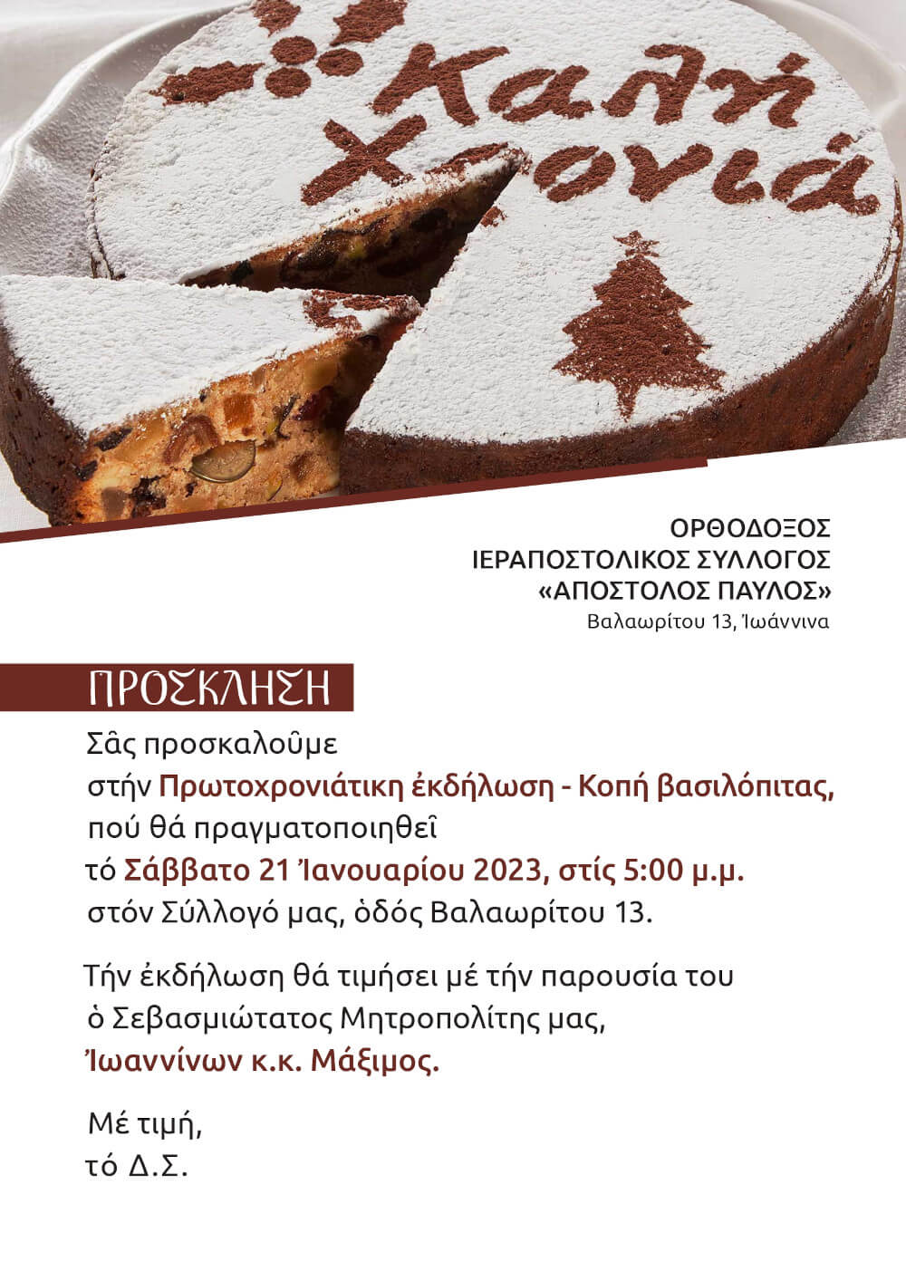 ΕΥΛΟΓΙΑ ΒΑΣΙΛΟΠΙΤΑΣ Τό ἑσπέρας τῆς 21ης Ἰανουαρίου 2023, ὁ Σεβασμιώτατος Μητροπολίτης Ἰωαννίνων κ. Μάξιμος Διαβάστε Περισσότερα